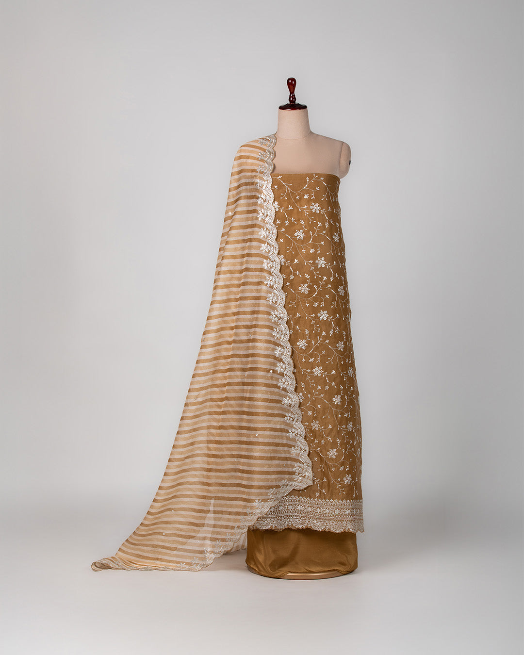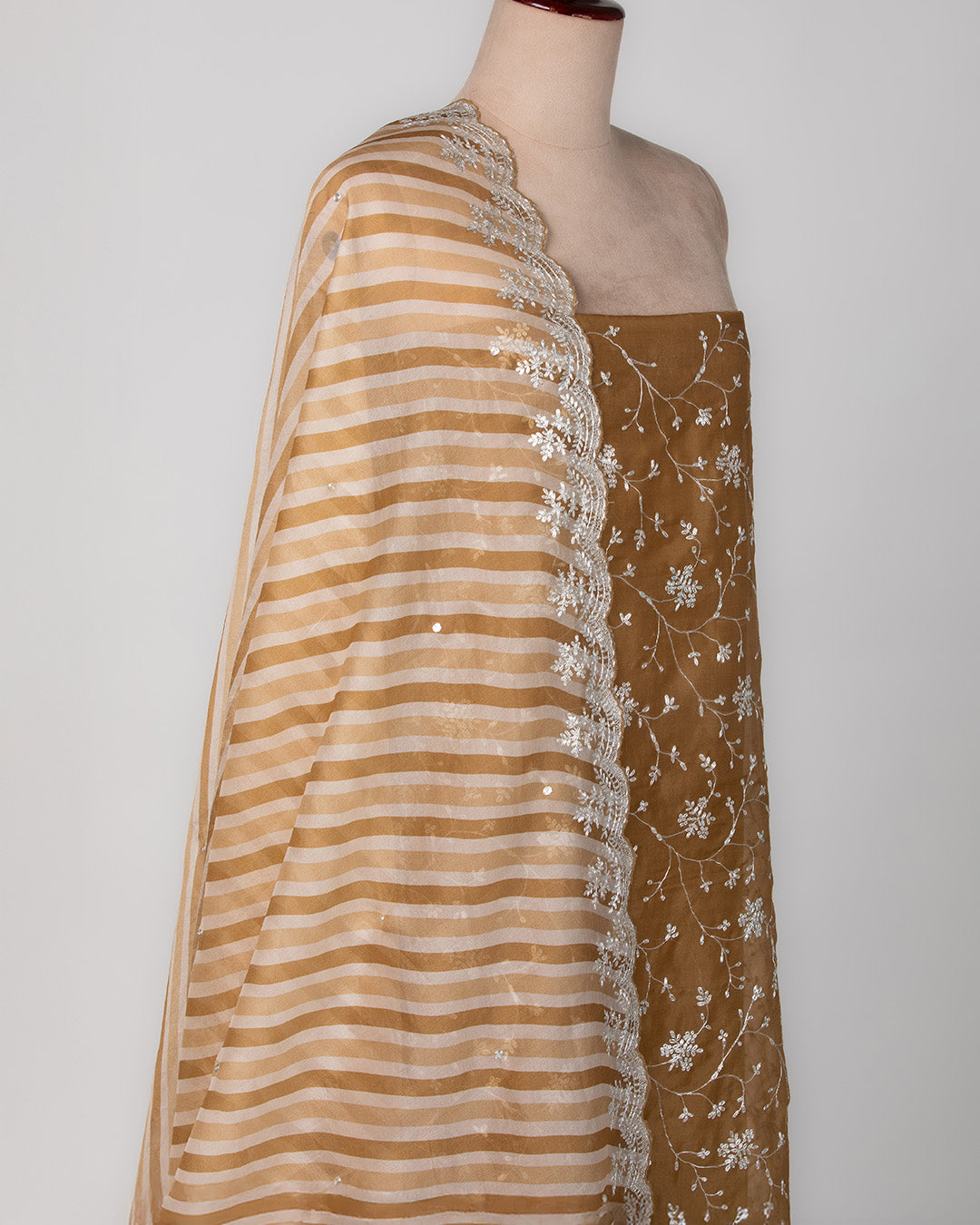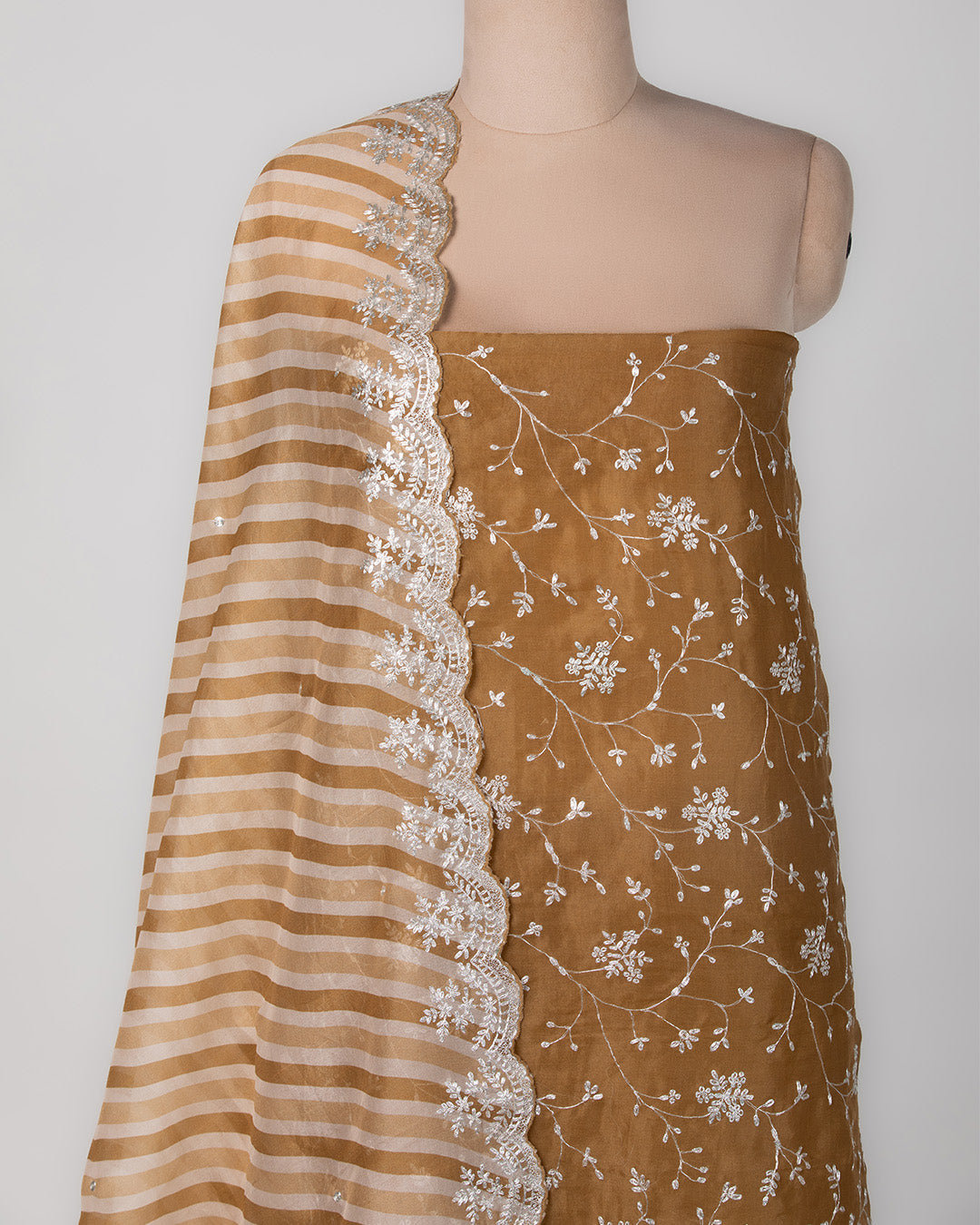 A rich amber organza suit set featuring intricate pita embroidery and a striped scallop dupatta that blends tradition with chic... Read more