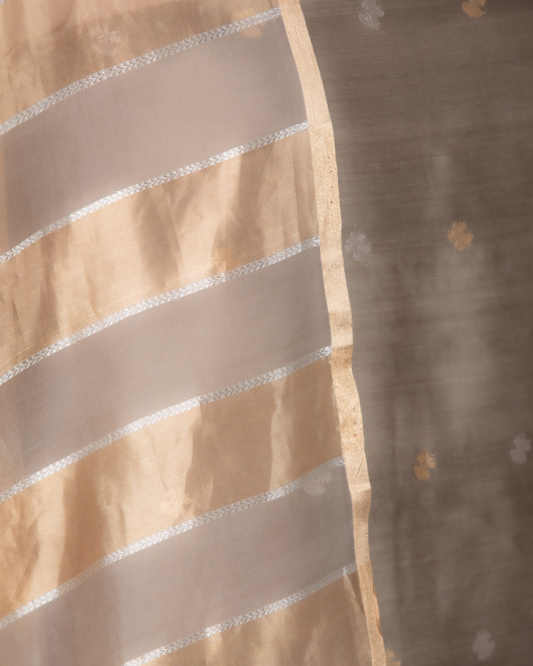 A rich taupe pure silk suit set with delicate banarsi bootis and a gold-striped dupatta for understated elegance.Kurta Length: 2.5... Read more