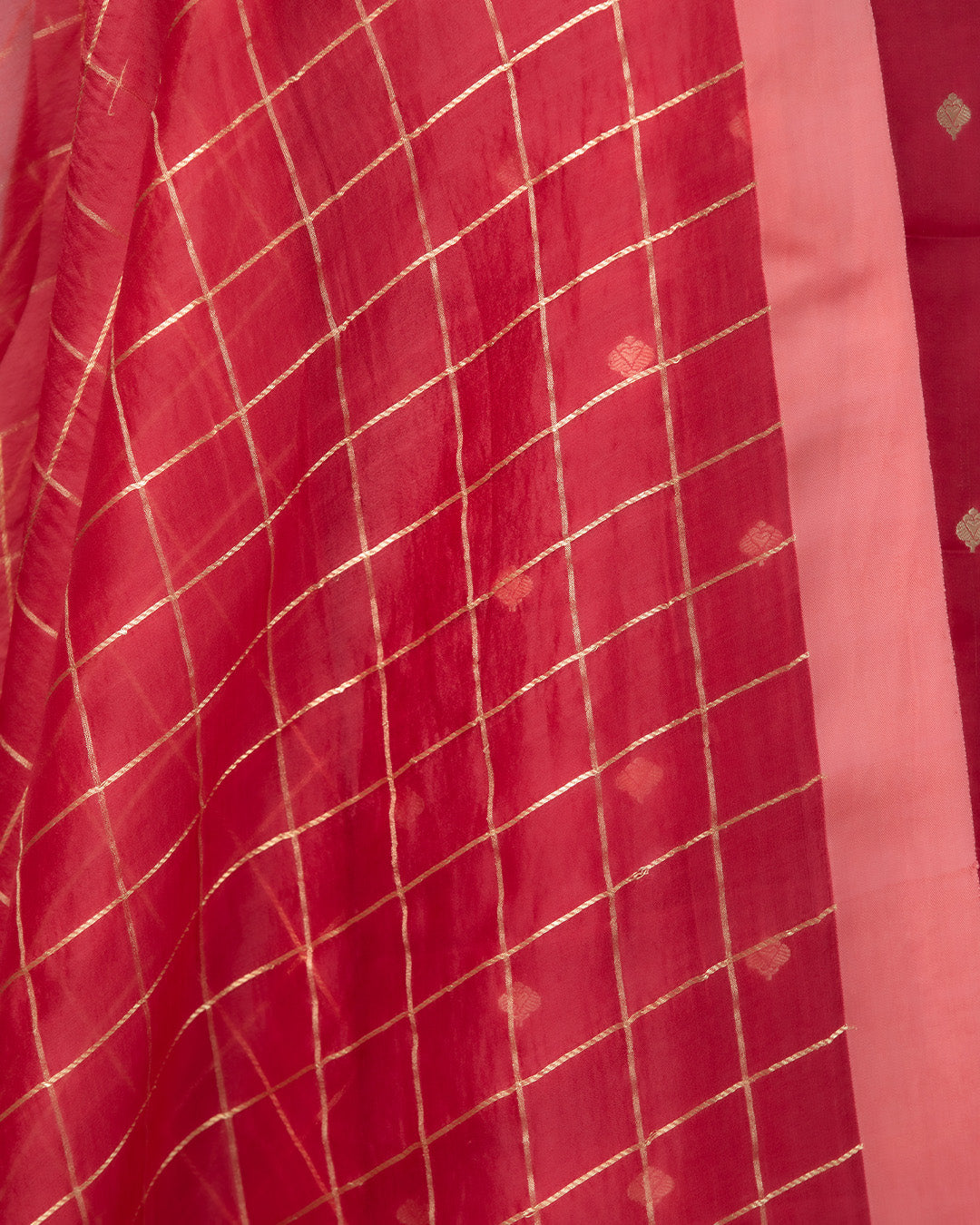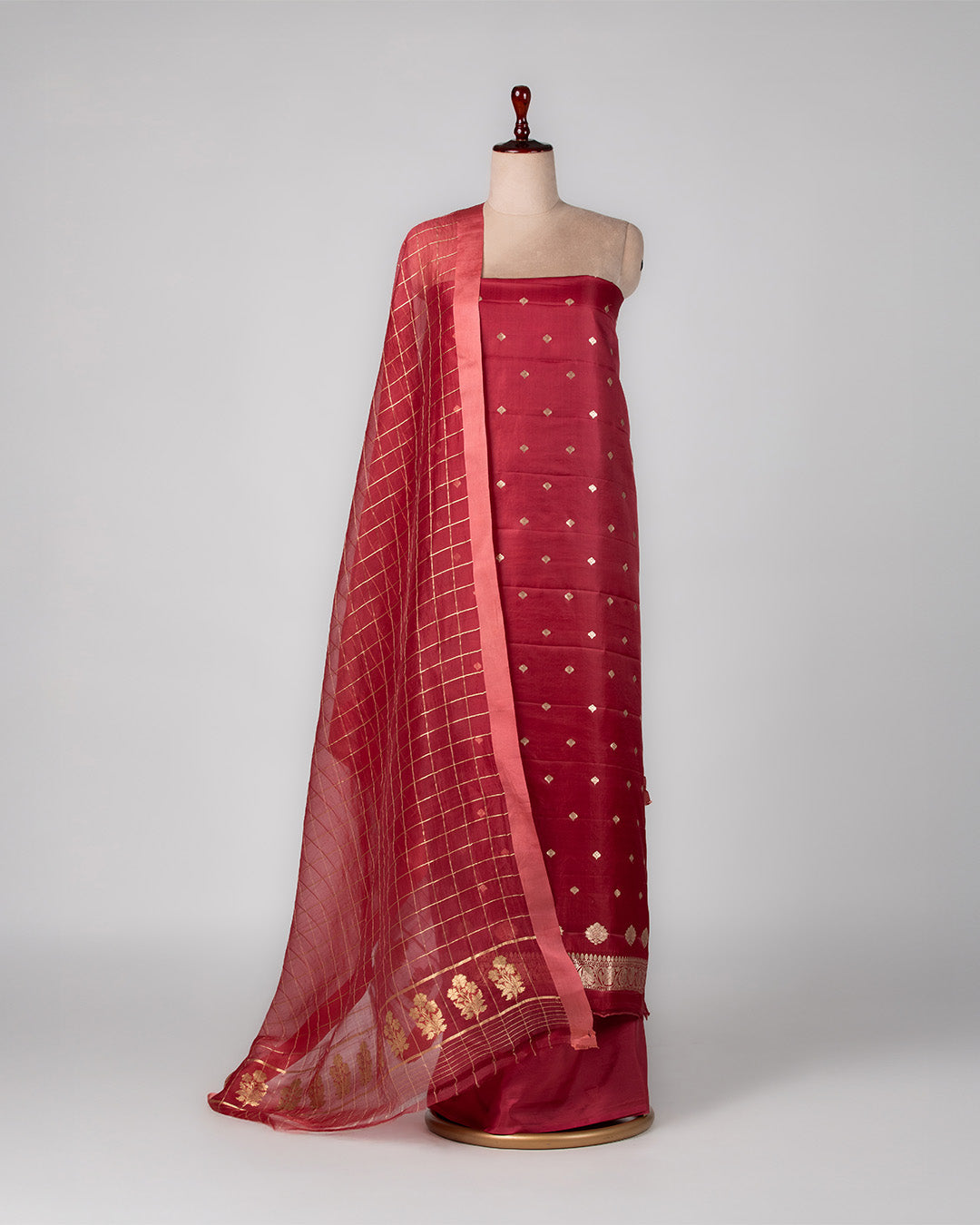 A regal carmine pure silk suit set featuring subtle banarsi detailing and a gold-checkered dupatta.Kurta Length: 2.5 meters approx Bottom... Read more