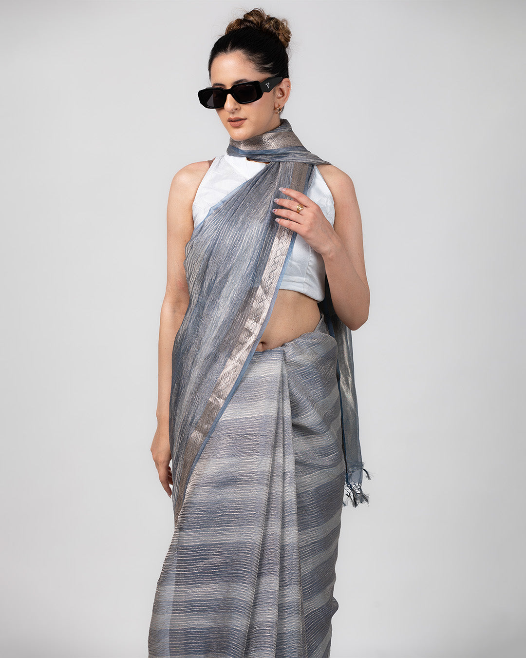 A contemporary striped saree in charcoal tones, woven in crush tissue with pure zari work for a bold yet refined... Read more
