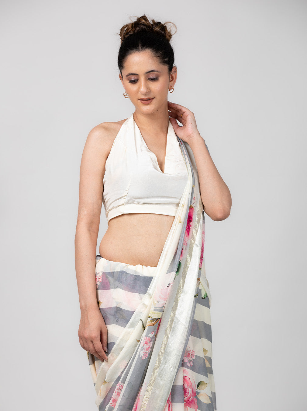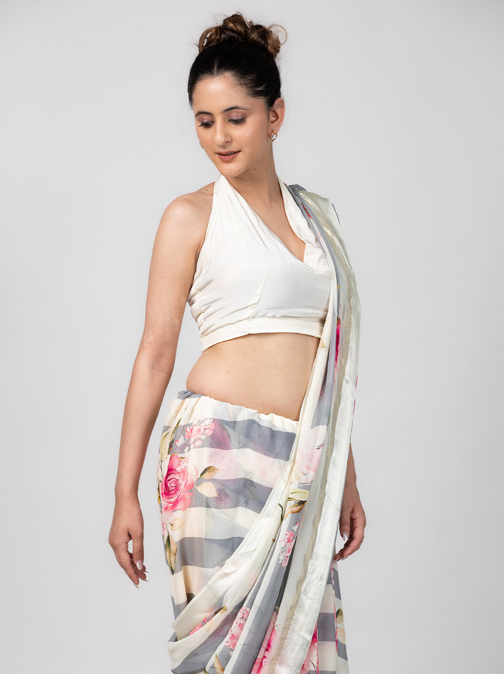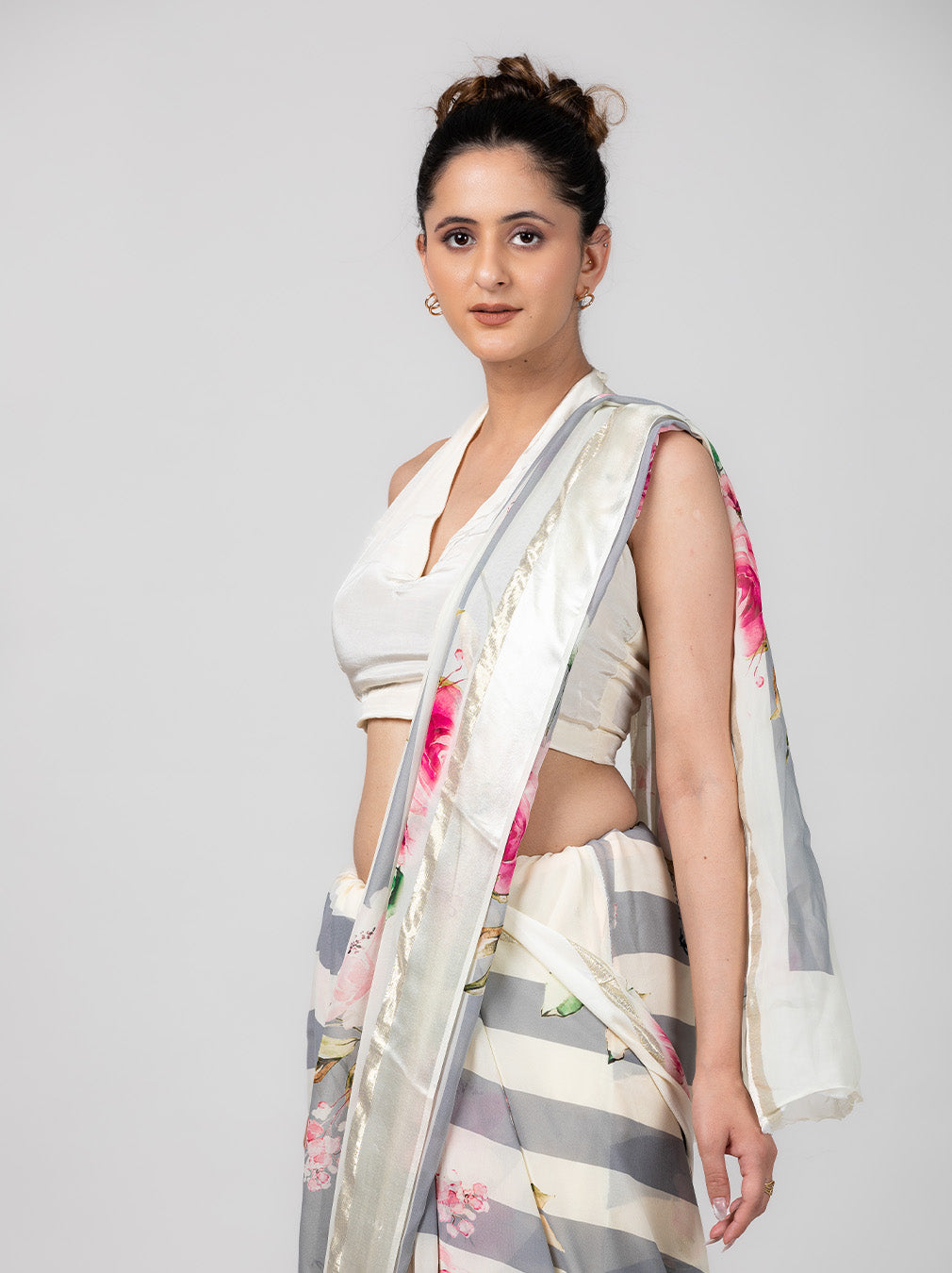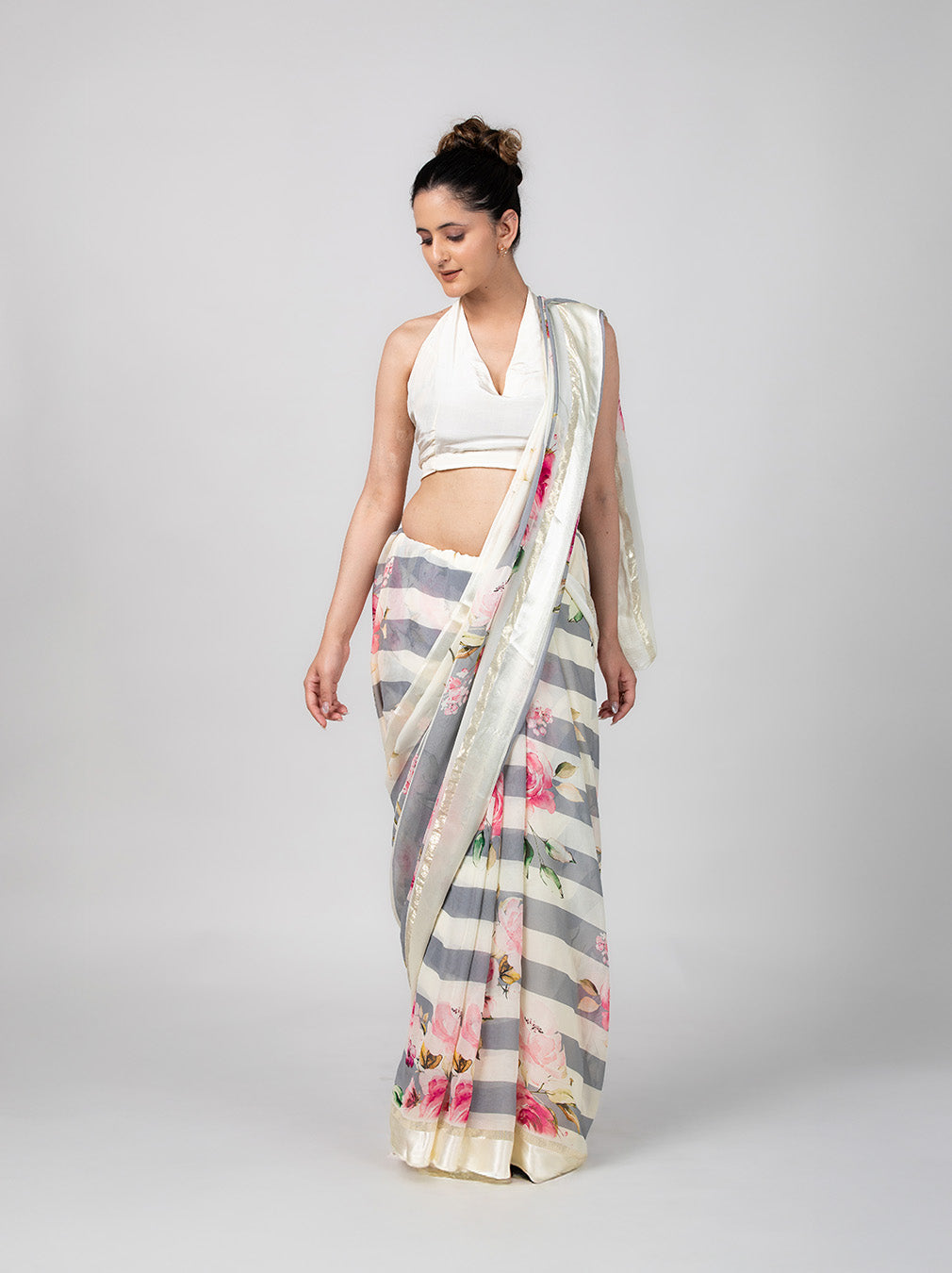 Soft grey-white stripes meet delicate floral prints on this pure georgette saree—a breezy, modern pick for brunches, garden events, or... Read more