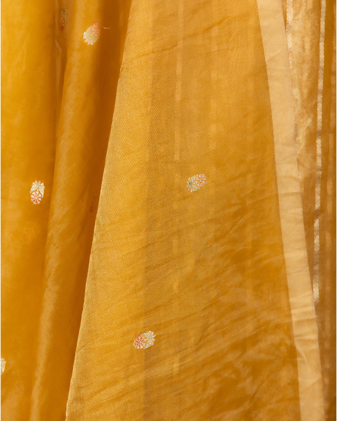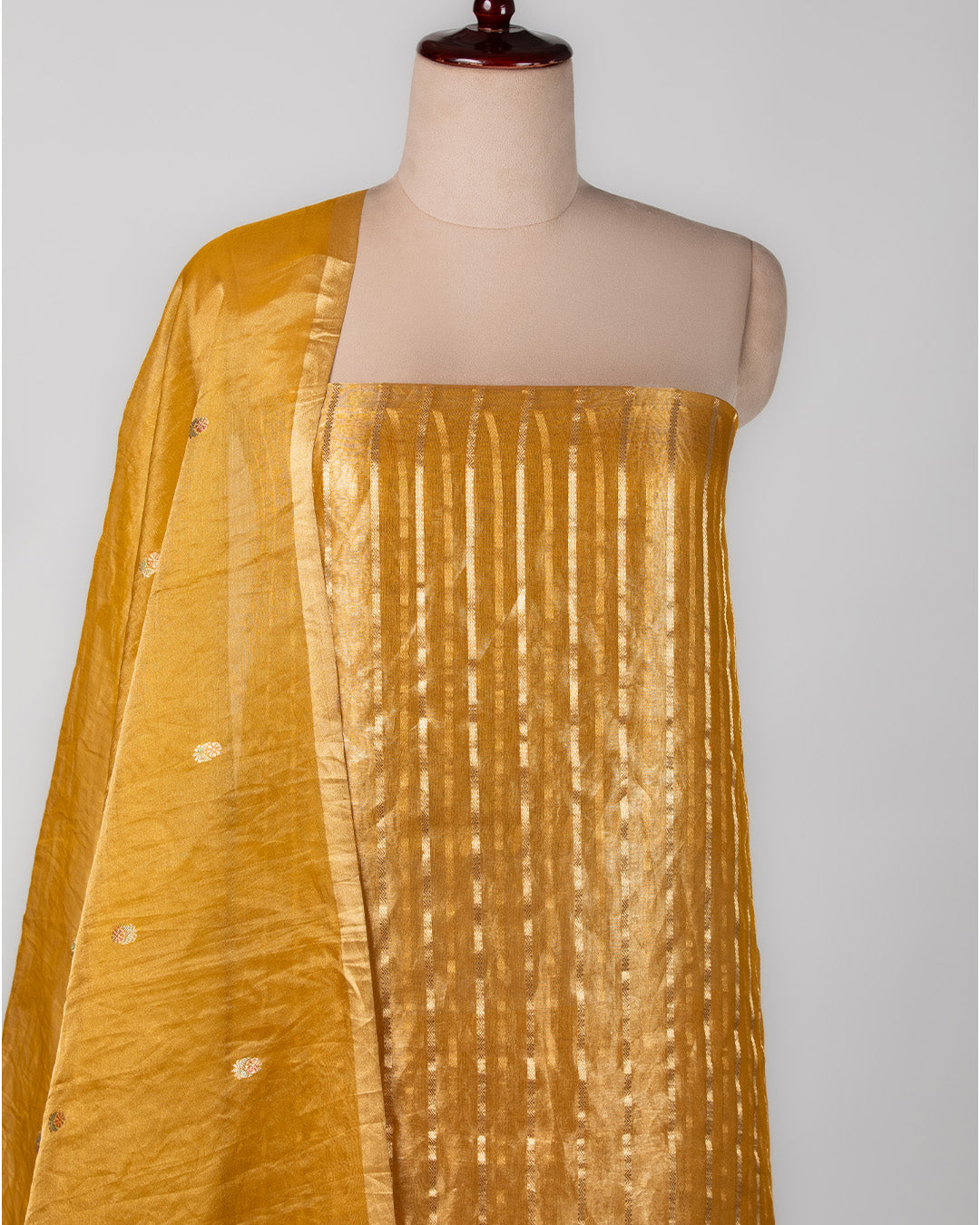 A mustard pure tissue suit set with woven zari stripes and a subtle festive charm. Kurta Length: 2.5 meters approx... Read more