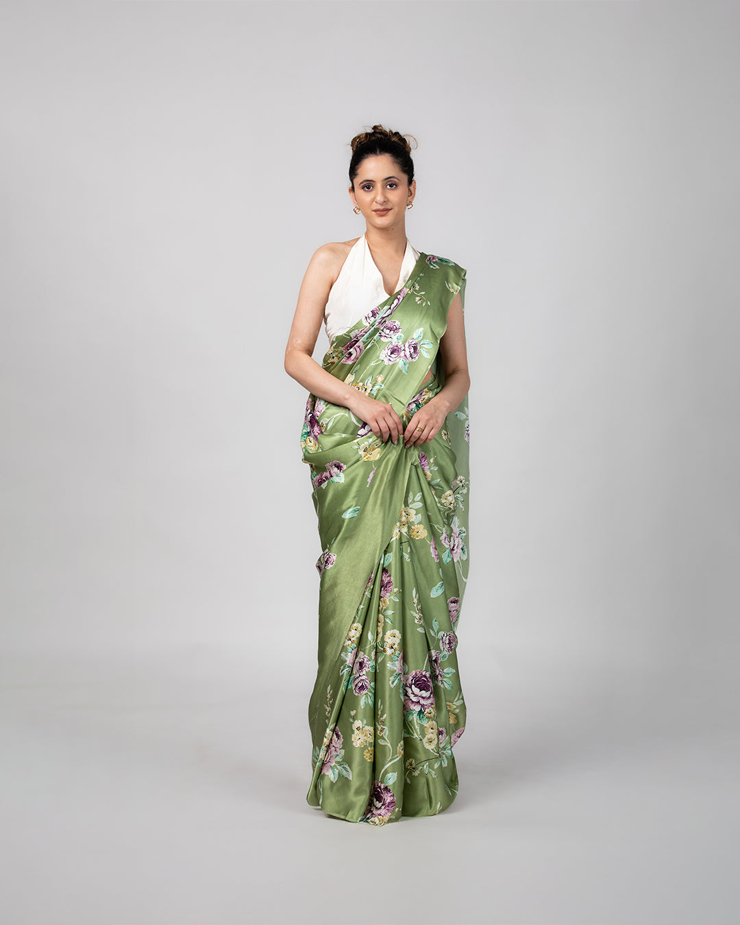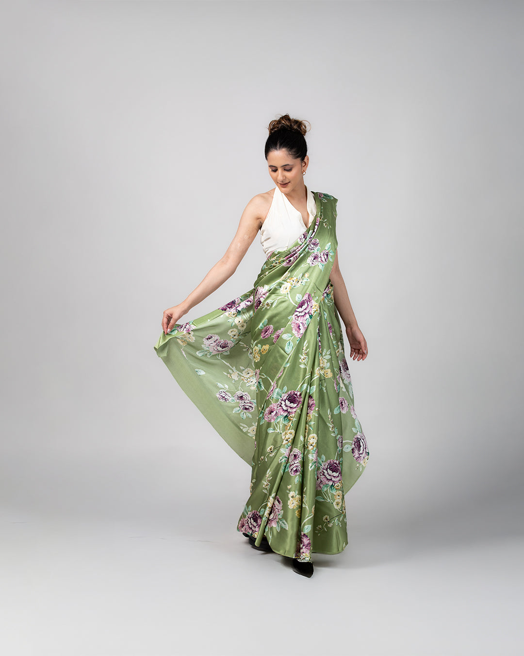 A soft green satin saree blooming with pastel florals, offering a breezy, graceful drape for day events, lunches, and garden... Read more