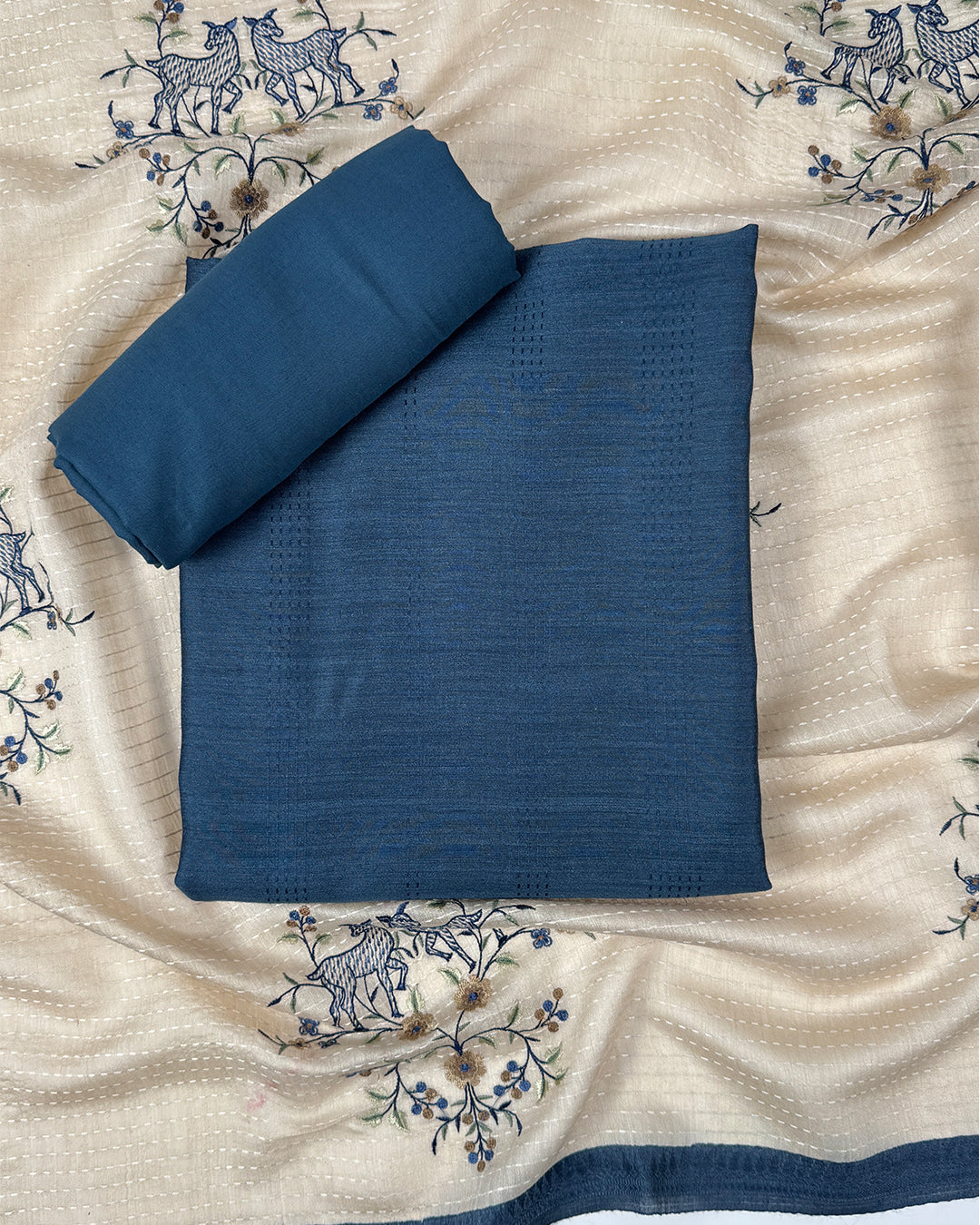 An elegant blue silk suit set beautifully enhanced with traditional Kantha embroidery. The rich sheen of silk combined with handcrafted... Read more