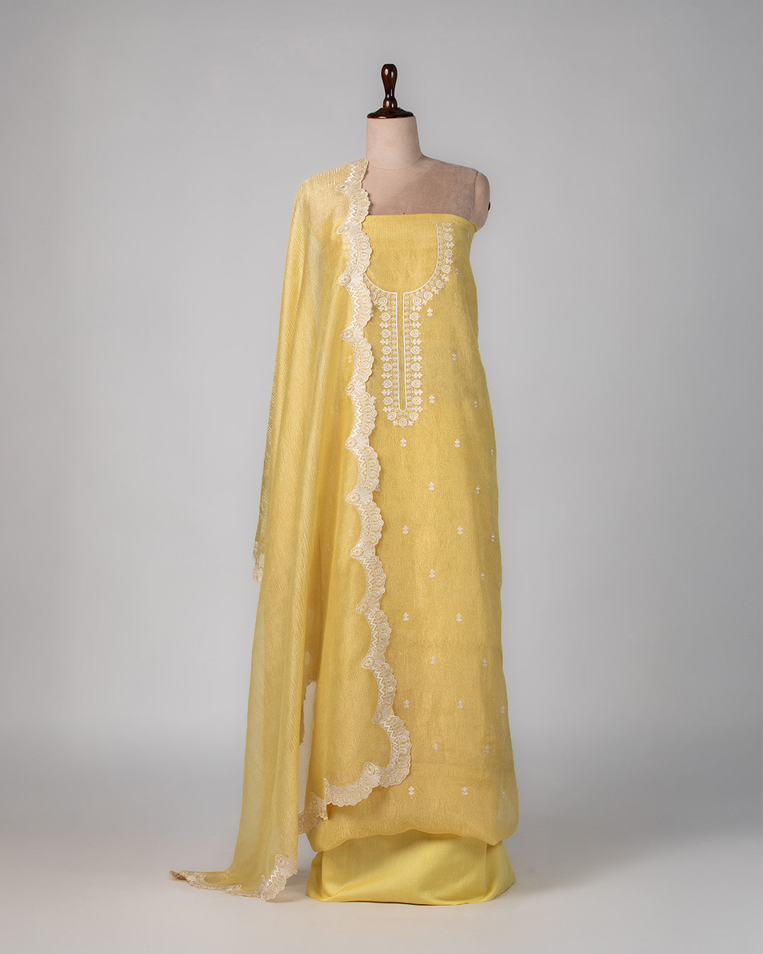 A light and airy crush tissue suit set in pastel lemon, adorned with intricate Parsi embroidery.Kurta Length: 2.5 meters approx... Read more
