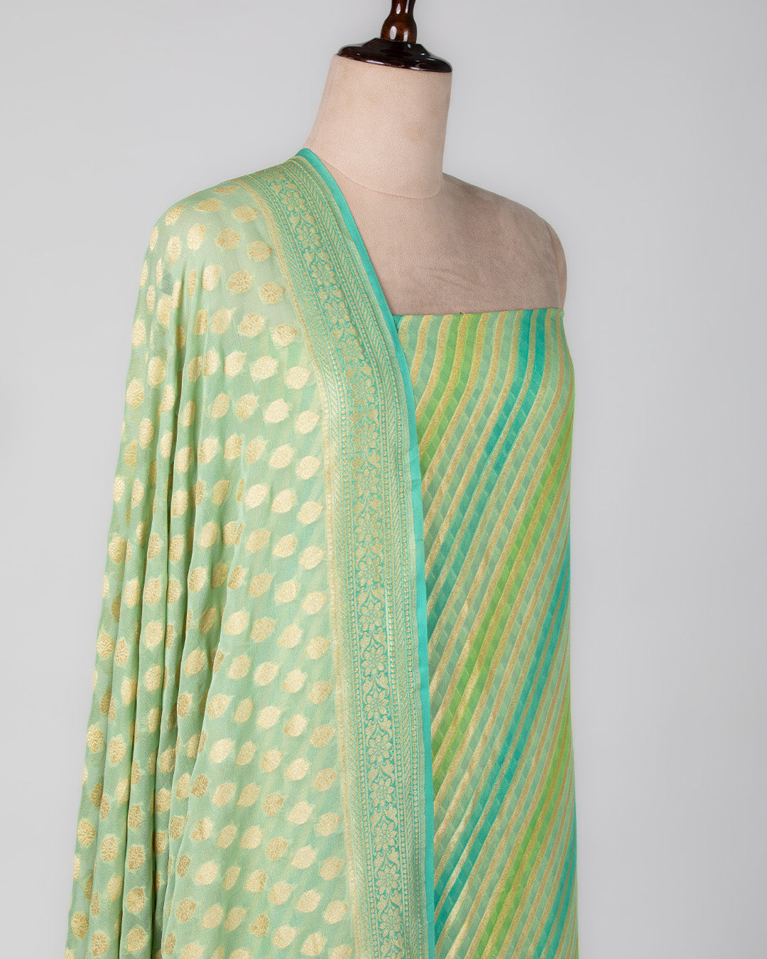 A fresh blend of mint green and gold stripes in pure georgette with Mysore weaving, paired with a dotted zari... Read more