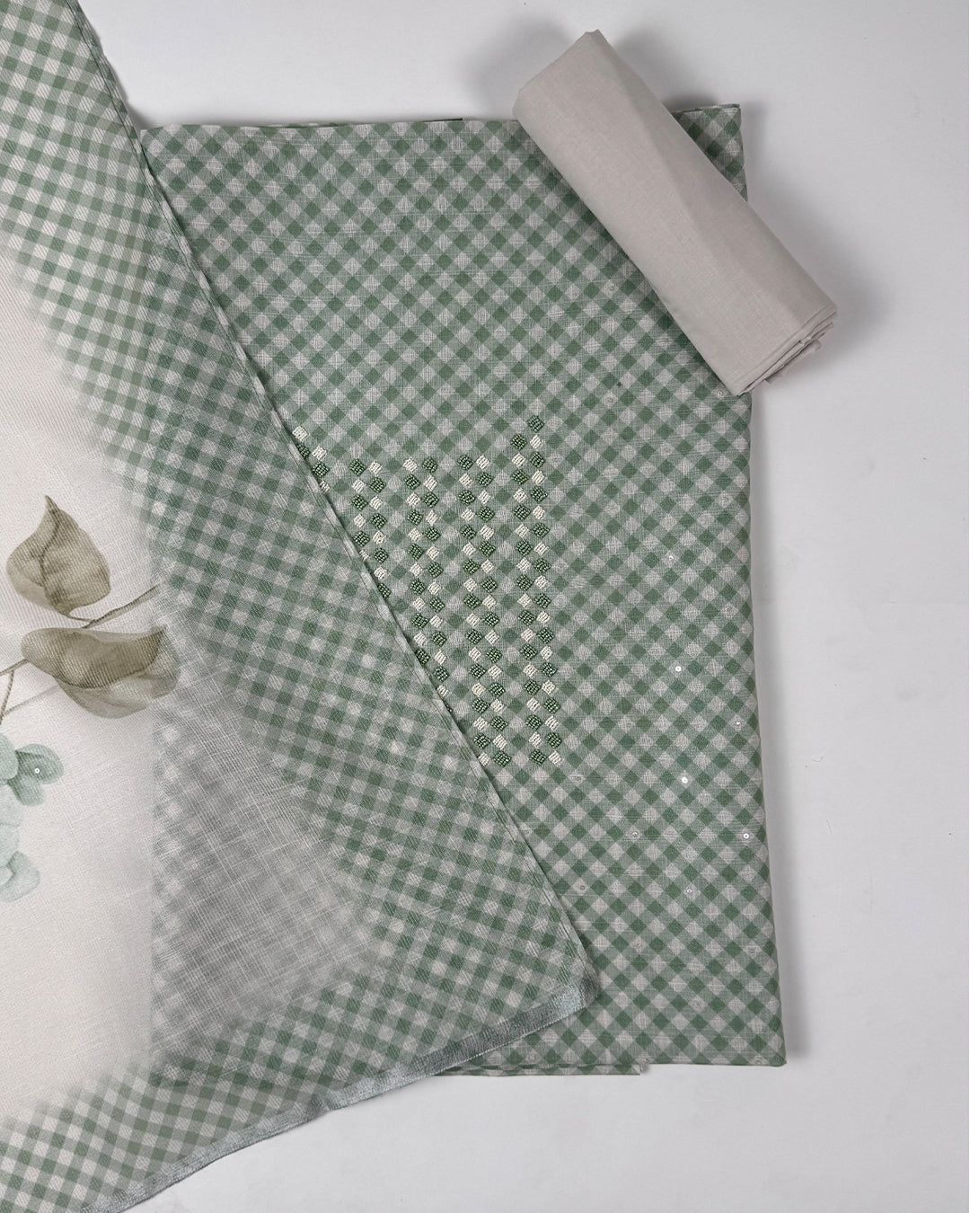 A graceful green tissue linen suit set featuring delicate pearl embellishments that add subtle sophistication. The lightweight tissue linen fabric... Read more