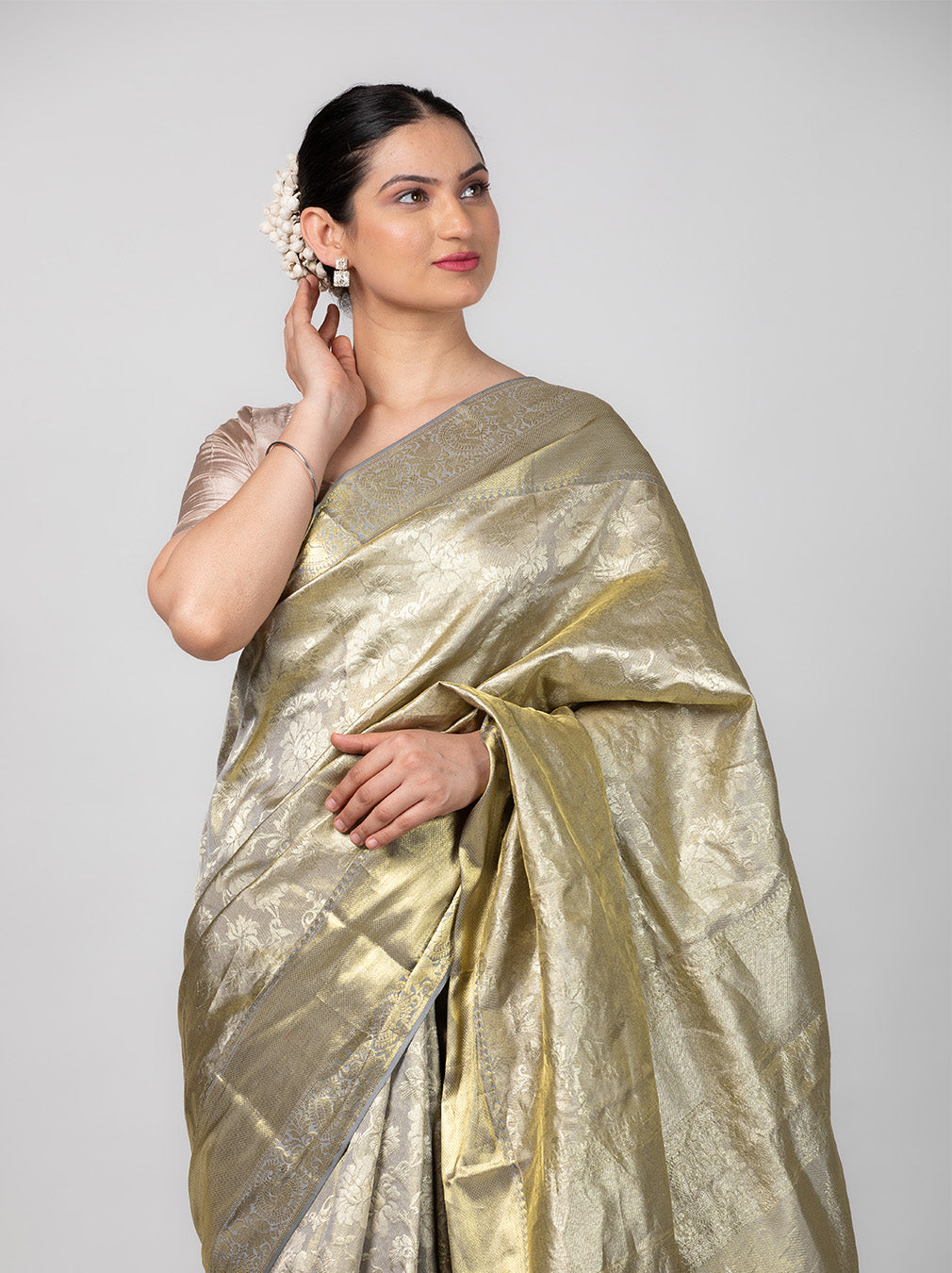 Crafted in silk tissue with a soft golden sheen and pure zari weave, this saree flows with quiet luxury—perfect for... Read more