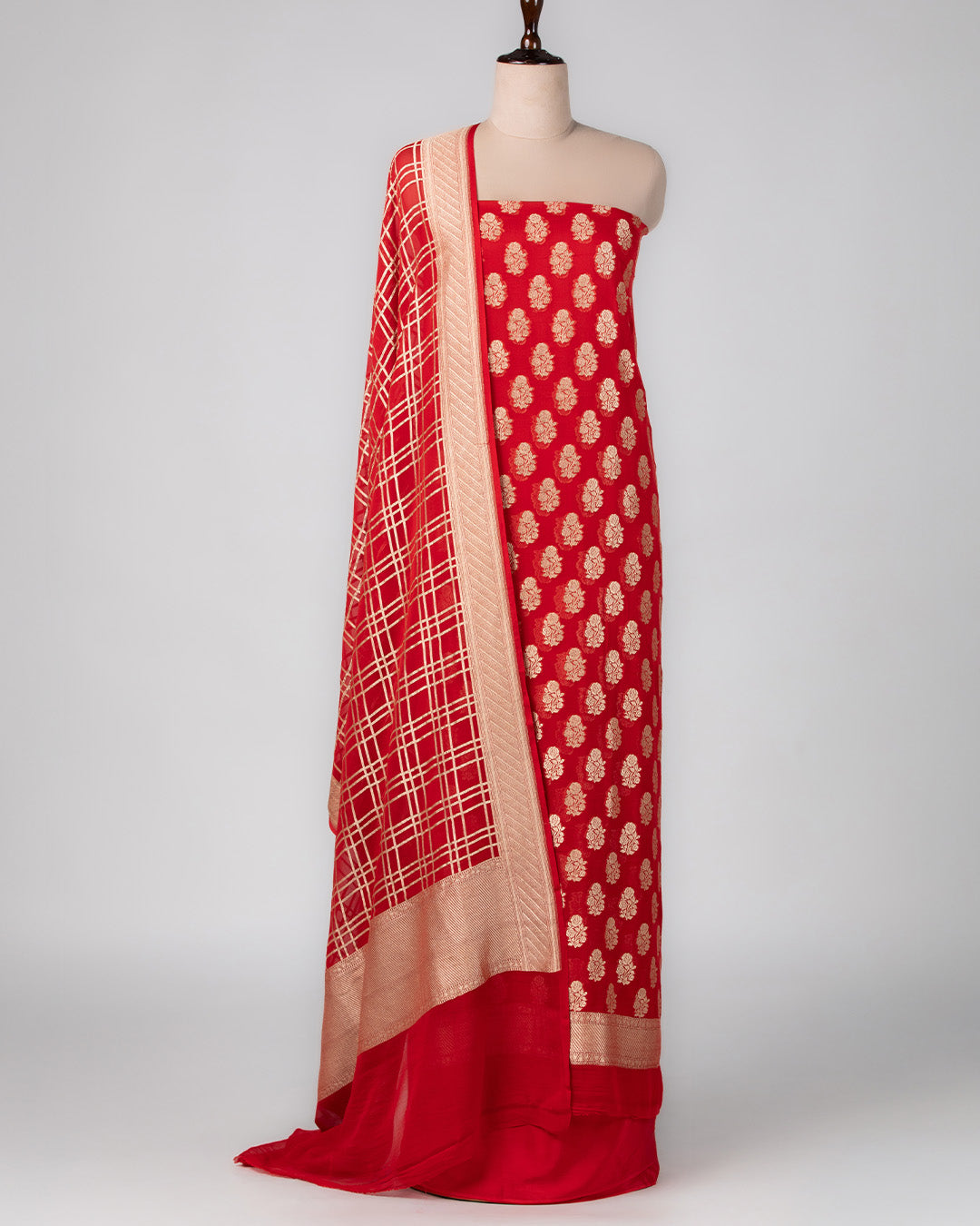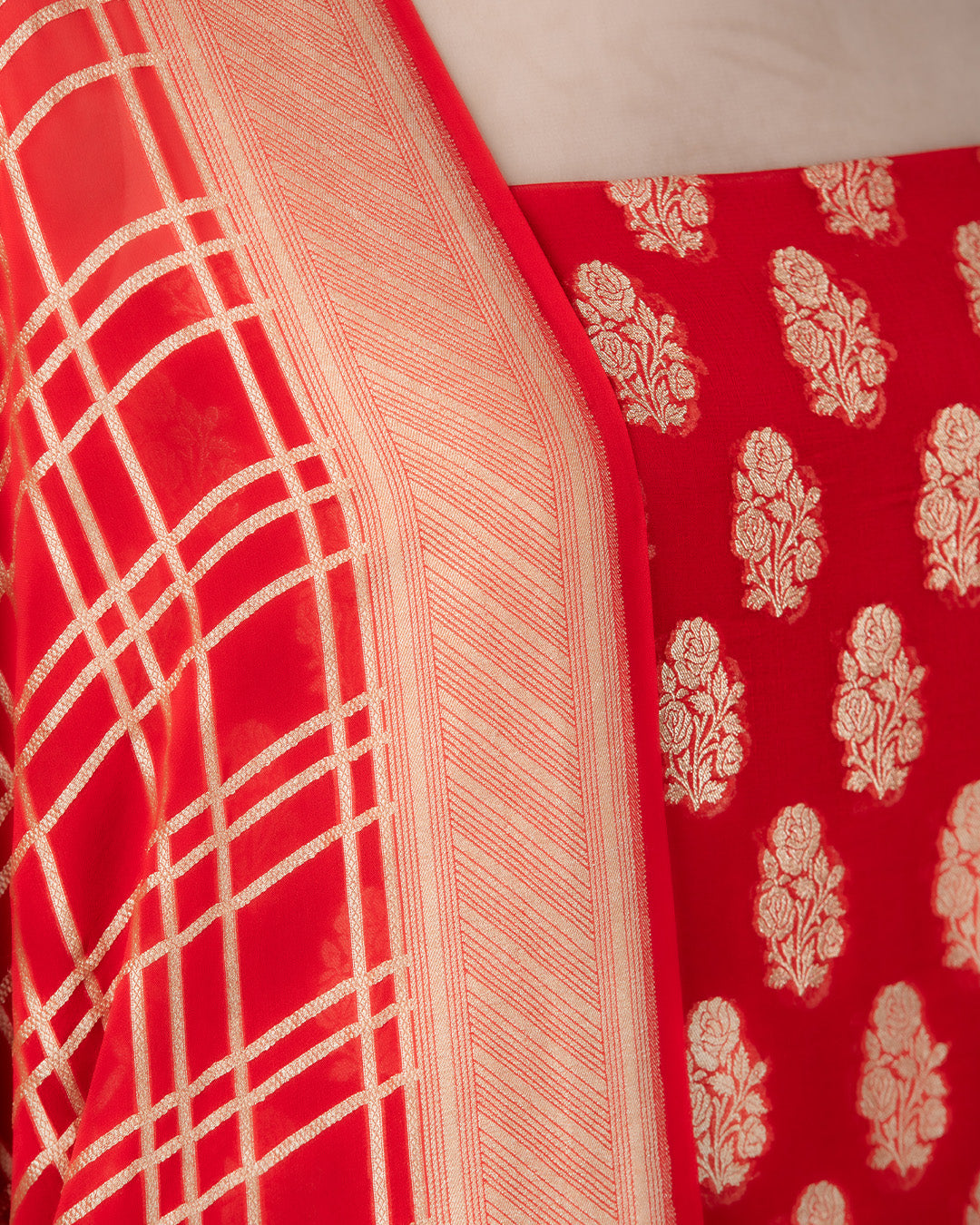 A rich red pure georgette suit set adorned with traditional Mysore weave. Kurta Length: 2.5 meters approx Bottom Length: 2.5... Read more