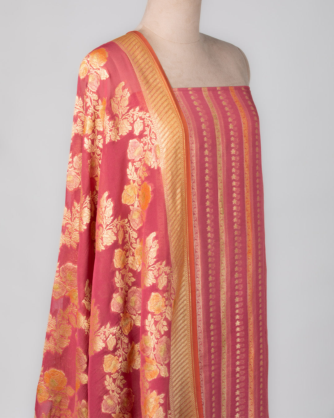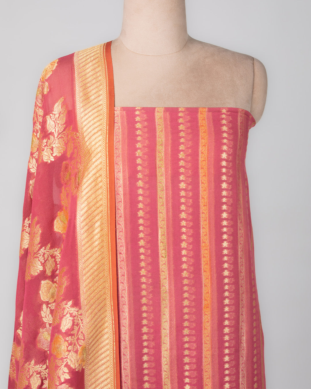 Soft rose-hued pure georgette suit set featuring classic Mysore zari stripes and floral detailing.Kurta Length: 2.5 meters approx Bottom Length:... Read more