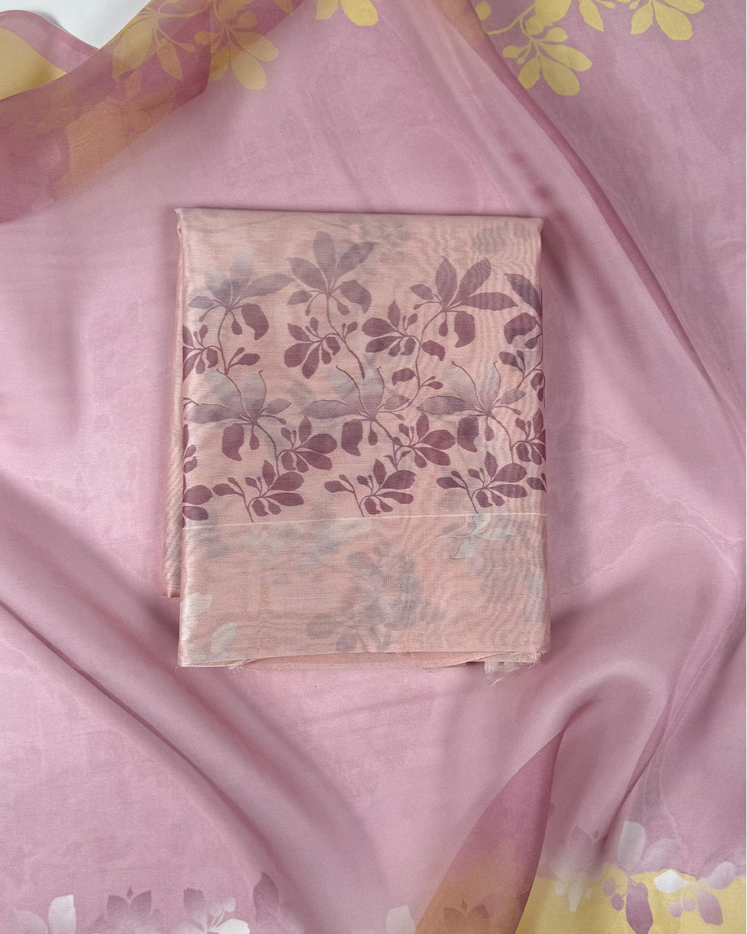 A soft light peach silk suit set featuring delicate printed designs that bring a fresh and elegant appeal. The luxurious... Read more