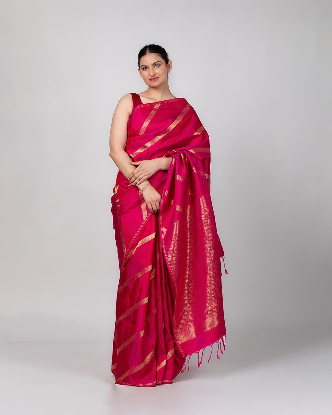 A bold magenta-pink pure silk saree woven with traditional Kanjivaram gold zari lines—where classic craftsmanship meets a fresh, standout silhouette.... Read more