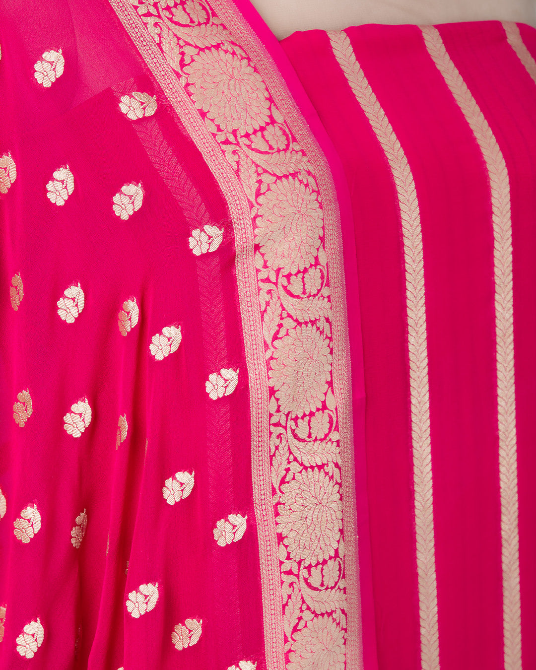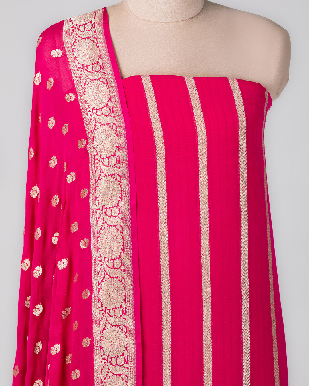 Striking rani pink suit in pure georgette with Mysore zari stripes and a delicately woven dupatta.Kurta Length: 2.5 meters approx... Read more