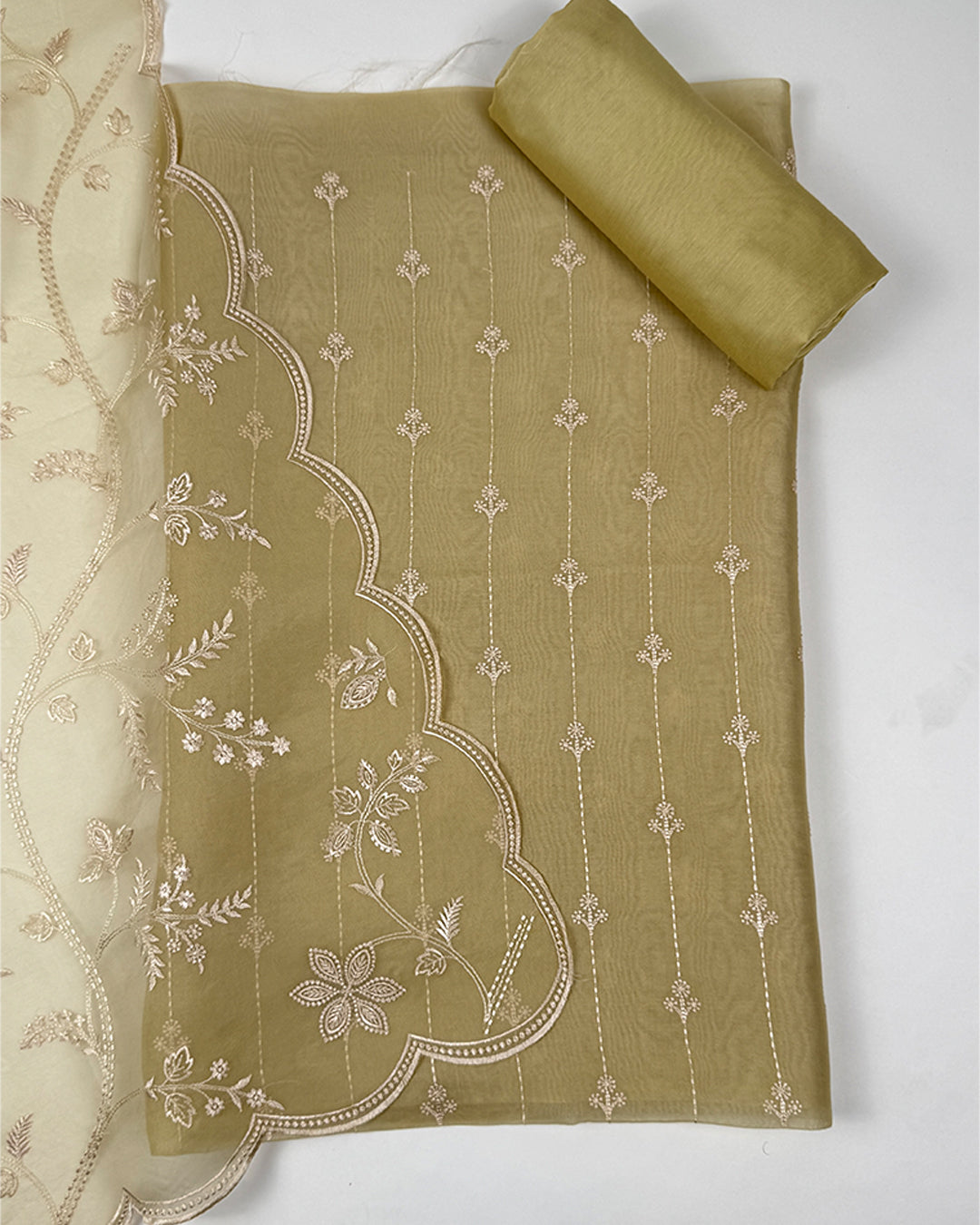 Components: 1 Unstitched Kurta (Organza) 1 Matching Unstitched Bottom 1 Dupatta with Thread Work (Organza)