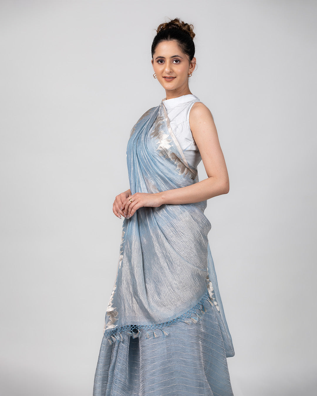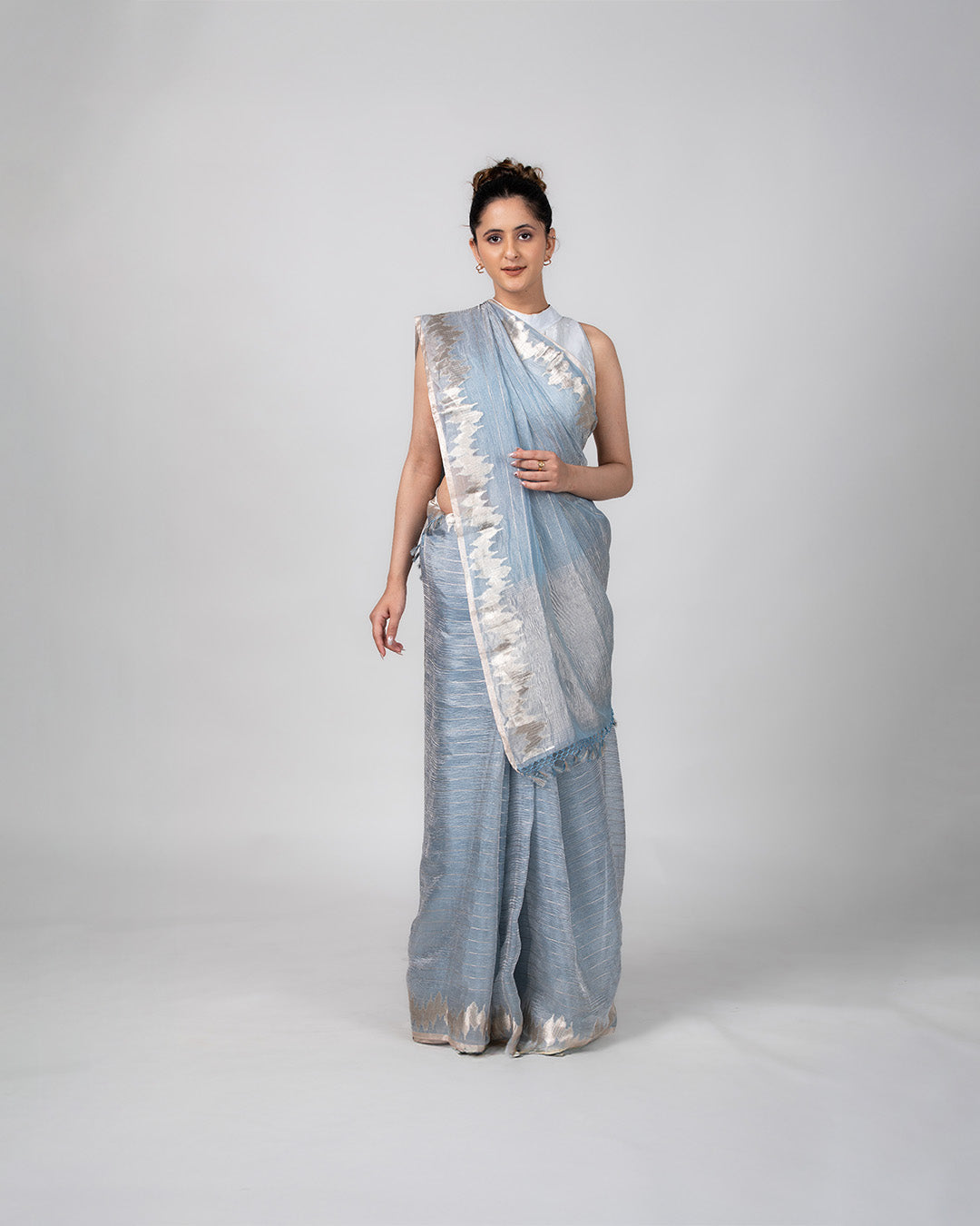 A soft sky-blue saree in crush tissue, highlighted with pure zari detailing for a graceful and festive charm. Saree: 5.5... Read more